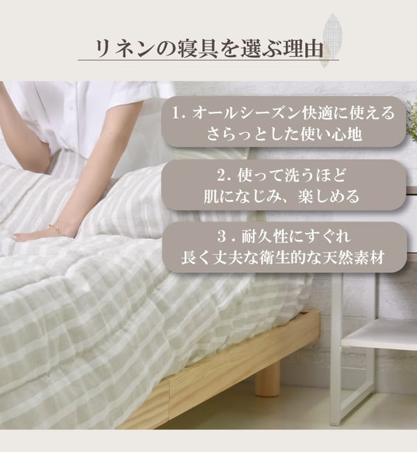 秋冬:冬には合わせないと思われがちですが、リネンには温度や熱を調節する機能があり一年中快適に使えます。空気を含み、やさしく、ふんわりと温かく感じます。